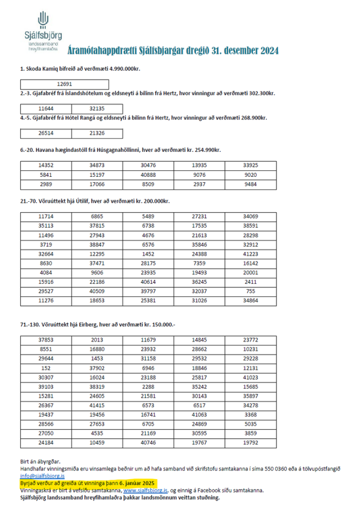 Dregið var í Áramótahappdrætti Sjálfsbjargar 2024 þann 31. desember 2024.